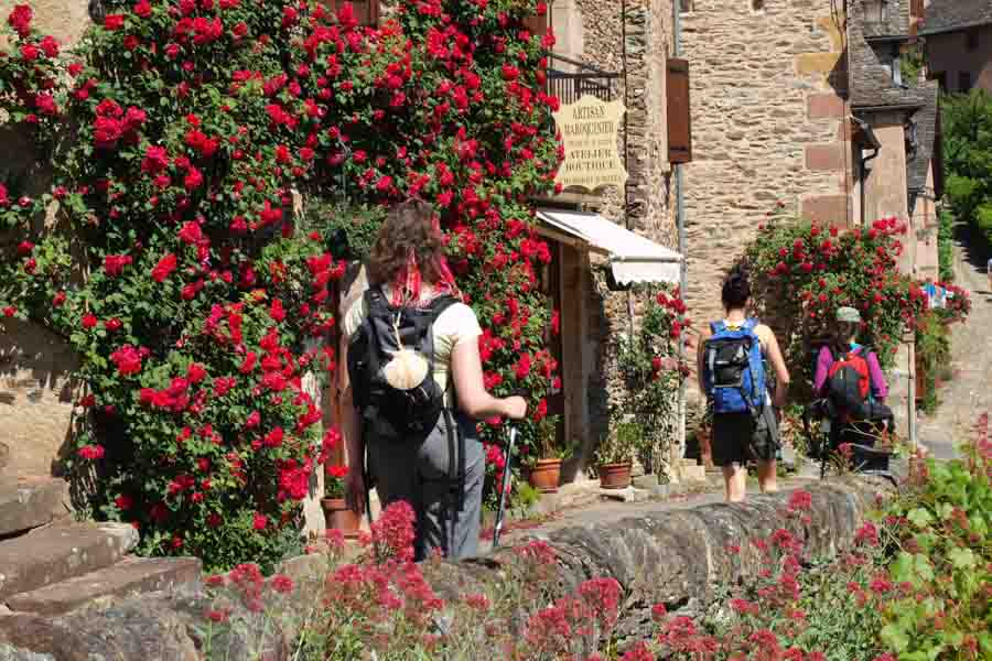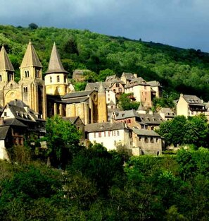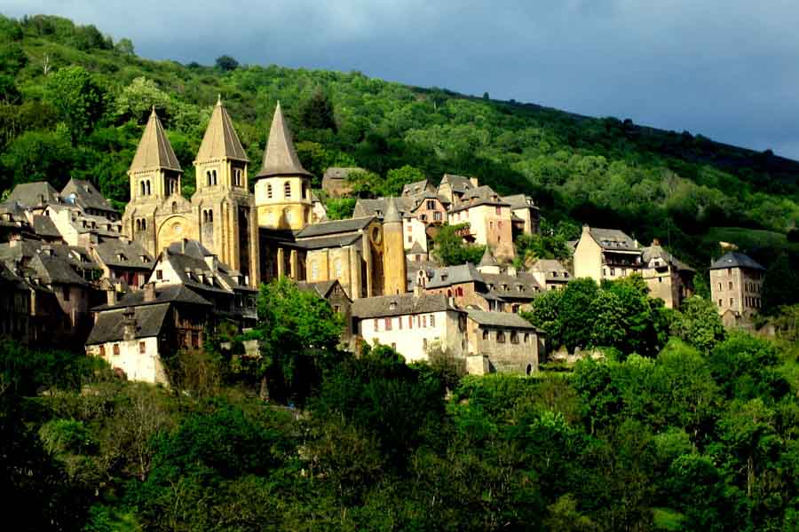 Découverte d'Espeyrac où la légende prétend qu'en 960, un pèlerin rendu aveugle suite à une agression, retrouva la vue en invoquant la patronne de Conques. Descente par la combe encaissée de l'Ouche, arrivée sur le Dourdou (qui se jette un peu au nord dans le Lot) et découverte de Conques, bourg aux toits pointus d'où surgissent les trois tours de l'abbatiale romane Sainte-Foy, joyau de l'architecture médiévale, classée Patrimoine Mondial par l'UNESCO, et de son pont des pèlerins qui permet de franchir le Dourdou.