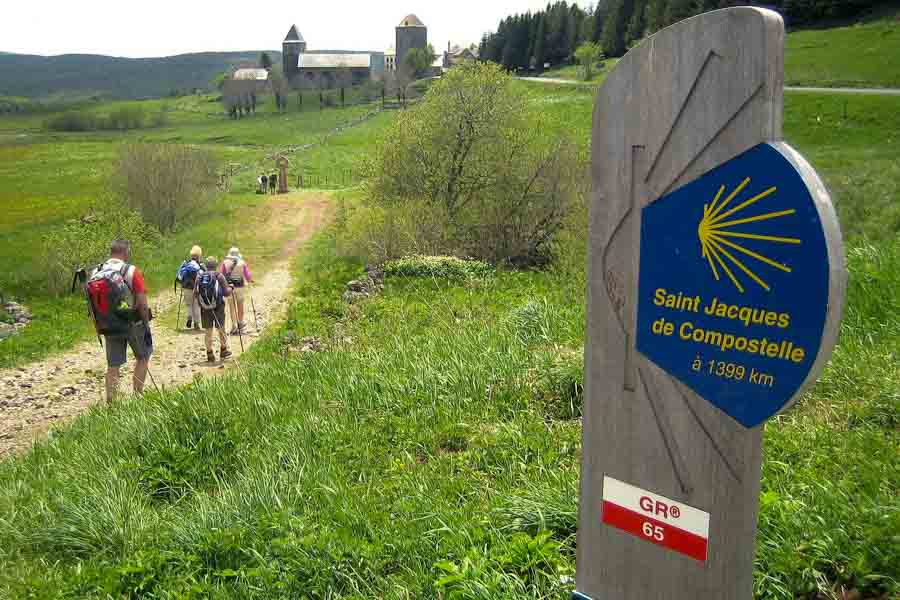 Depuis Aumont-Aubrac, en « Terre de Peyre », comprendre terre de pierre, le chemin de Compostelle traverse de jolis bosquets de pins avant de rejoindre les immensités de l'Aubrac tapissées de pâturages à perte de vue et ponctuées de burons. Ces terres sont le pays du célèbre couteau de Laguiole, instrument indispensable pour couper le fromage du même nom.