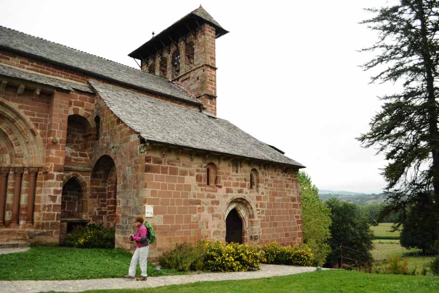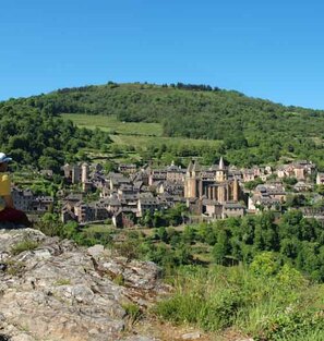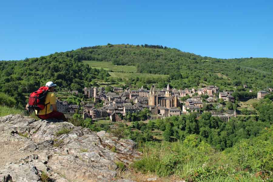 Conques fait souvent partie des coups de cœur du pèlerin. La vue sur ce village est saisissante pour qui vient de l'est. Descente par la combe encaissée de l'Ouche et arrivée sur le Dourdou (qui se jette un peu au nord dans le Lot). Découverte de Conques, bourg aux toits pointus d'où surgissent les trois tours de l'abbatiale romane Sainte-Foy, joyau de l'architecture médiévale, classée Patrimoine Mondial par l'UNESCO, et de son pont des pèlerins qui permet de franchir le Dourdou.