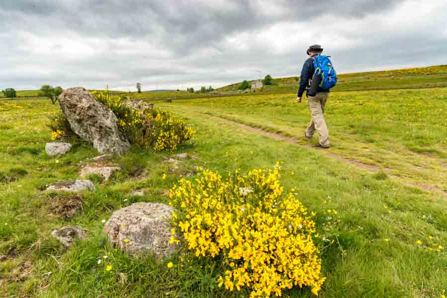 Depuis Aumont-Aubrac en « Terre de Peyre », comprendre terre de pierre, le chemin de Compostelle traverse de jolis bosquets de pins avant de rejoindre les portes de l'Aubrac à Prinsuéjols.