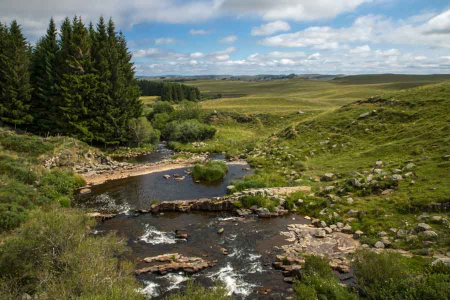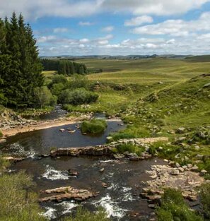 Traversée des immensités de l'Aubrac tapissées de pâturages à perte de vue et ponctuées de burons. Ces terres sont le pays du célèbre couteau de Laguiole, instrument indispensable pour couper le fromage du même nom.