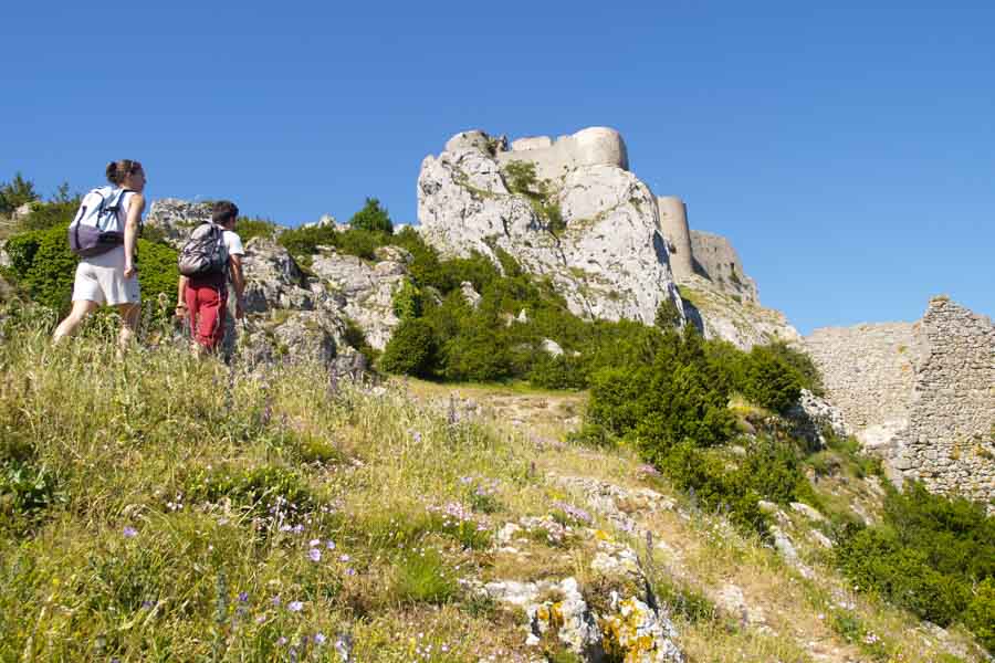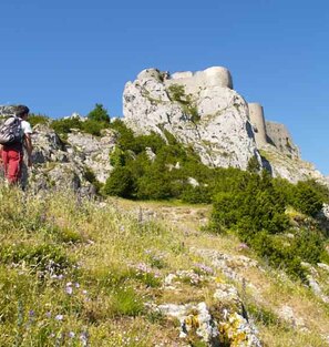 Au cœur de paysages de garrigues, forêts et profondes gorges calcaires, se dressent les châteaux « Cathares ». Majestueusement perchés sur des pitons rocheux, ils témoignent de plus de 800 ans d'histoire, baignés par le soleil généreux du sud de la France et balayés par les vents du marin et de la tramontane. Avec les Pyrénées en toile de fond, vous explorez une moyenne montagne au relief accidenté.