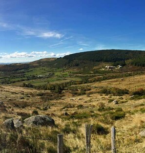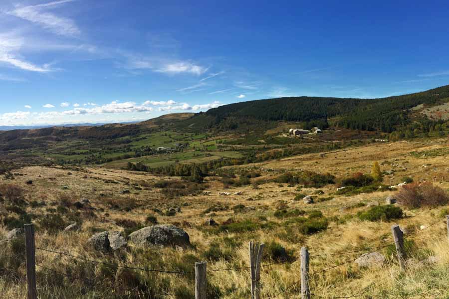 Traversée de la Montagne du Goulet à 1450 m d'altitude et passage à proximité des sources du Lot cachées dans la forêt de résineux. Avant de descendre au Bleymard, contemplation d'un beau panorama sur les croupes dénudées du Mont Lozère.